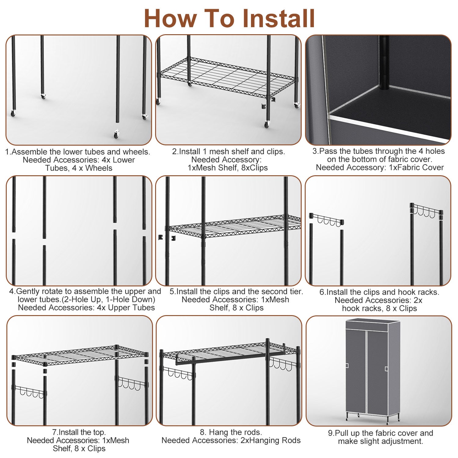 - *Multiple Ways of Installation*: Our garment rack can be installed in 4 ways:rack with wheels and cover,rack with feet and cover,rack with wheels but no cover,rack with feet but no cover etc.. All tools included,easy to install.