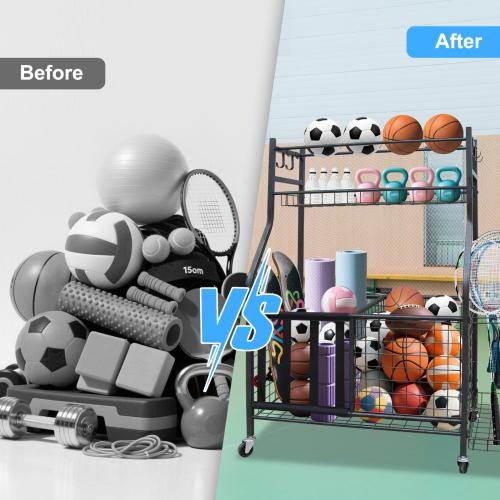 - [Multi-functional Storage Rack] 1.Dedicated baseball bat holder: stable anti-tilt side design with extended slots; 2.Top ball rack and metal mesh basket for storing small balls and kettlebells; 3.Two large-capacity storage boxes: convenient for storing basketballs, volleyballs, yoga mats, and other sports equipment; 4.Thickened anti-slip hooks: can be used to hang helmets and other items.